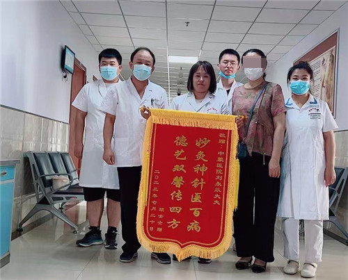 7月26日,患脑出血好转出院的顾阿姨亲手将一面写有“妙灸神针医百病,德艺双馨传四方”的锦旗送到门诊部主任刘永乐手中,连声称赞刘主任医德高尚、医术精湛,表达了对刘主任的感激之情。