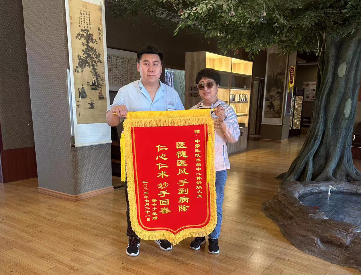 “我听说中蒙医院有疼痛康复特色治疗,抱着试一试的想法到治未病中心就诊,希望早日摆脱腰疼的困扰。医务人员态度好,特别亲切,服务很周到,通过一周多时间治疗,现在不疼了,太感谢韩大夫了!”,送上锦旗的腰痛患者说。