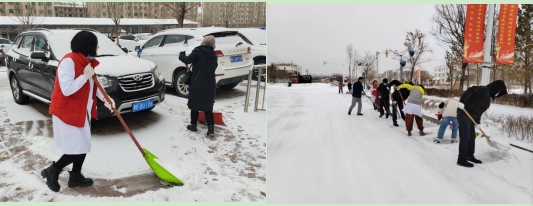 当天清晨,大家不畏严寒,克服雪天交通困难,按时到岗到位,拿起扫帚、雪铲等工具,来到患者就诊入口和周边道路,开始清扫积雪。他们的身影在清晨的寒风中显得格外坚定,每一铲、每一扫都是在为患者扫出一条“安全路”而努