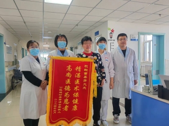 3月27日,脑病科患者眼含热泪,激动地将一面写有“精湛医术保健康 高尚医德为患者”的锦旗送到了苗果芳主任手中,锦旗上的一字一句都是患者对医护人员仁心仁术的肯定和信赖。