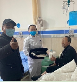 病房里这位老人姓程,是位无儿无女的五保户。看着比自己父亲还要大一些的程大爷,内二科李冬梅护士在得知老人身患疾病又无人照顾的情况后,心里有说不出的疼。本着“守护健康,老吾老以及人之老”的善念,为人女儿的李冬梅比平常格外细致地护理着这位大爷。李冬梅护士暗暗留意着老人生活上有什么需求及困难,总是想着第一时间给予帮助。她发现程大爷平日里没有换洗的衣服,就回家找出自己父亲没穿过几次但干净整洁的衣服拿来送给程大爷。程大爷看到后露出久违的笑容,幸福和感激之情洋溢在老人的脸上。