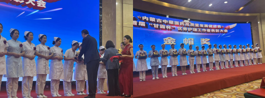在第113个“5·12”国际护士节来临之际,5月9日,内蒙古中蒙医药高质量发展促进会首届“甘露杯”优秀护理工作者表彰大会在呼和浩特举行。我院狄飞护士长获金灯奖,李敏护士长获金帽奖。