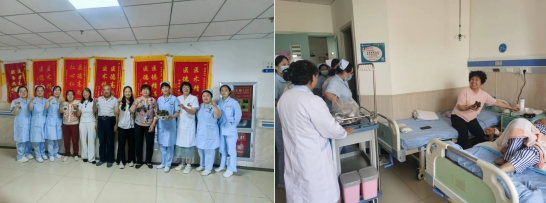 在脑病科病区,护理部主任黄杰与科主任、护士长以及科室医护人员,共同为患者和家属送上端午祝福,将医院的问候和关怀带到了每一位患者的床边。