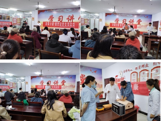 活动现场,首先由临床医技支部书记苗果芳对传染病防控、鼠疫联防联控及老年人饮食起居运动进行宣讲,并由护理部李敏主任和团队成员为社区居民介绍了急救技能海姆立克急救法和心肺复苏相关知识内容。